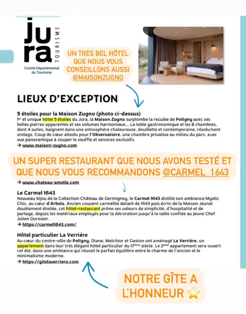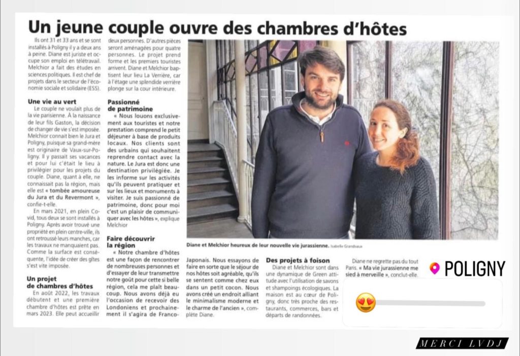 Au cœur de Poligny, dans le Jura, notre chambre d’hôtes et notre gîte 4 étoiles attirent l’attention des visiteurs, mais aussi des médias ! Entre authenticité, charme et expériences uniques, La Verrière est régulièrement citée dans des articles et recommandations pour son atmosphère chaleureuse et son cadre d’exception.